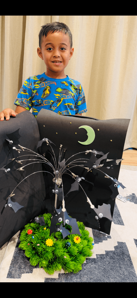I jazzed up my ornament by adding googlie eyes to my bats. I also jazzed up my ornament by creating a background with stars and the moon. I created a forest floor with some flowers to attract the bugs (i had ladybugs on the floor) so the bats on the ground can forage for food. I also added some mushrooms just to add colour and make it special. Our stand which my brother and I share we found at a thrift store and use it to represent a tree in which the bats were hanging from. It worked out well for us because it came with the clips so it made it easy to place the bats. I have also icluded a video so you can see a close up of the ladybugs.